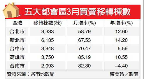 五大都會區3月買賣移轉棟數全數出爐,總計3月交易量達12,259棟,較2月11,250棟大增71.19%,若與工作天數相同的1月相比,則衰退11.32%。五都以高雄市表現最突出,量能較2月大增八成五,也較去年同期成長10.55%。