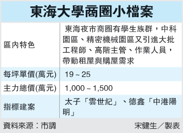 區域介紹:位于臺中市西屯跟龍井區相鄰的東海大學,主要商圈內的東海夜市商圈,消費族群以東海大學、靜宜大學及弘光科技大學的學生為主。目前,東海夜市商圈不僅有學生族群,也因中部科學園區、臺中精密機械園區成長,大批工程師、高階主管、作業人員等紛紛涌入,連帶創造大量租屋與購屋需求,成為高投報的大學商圈。