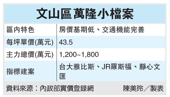 區域現況:萬隆生活圈,目前舊公寓約占住宅產品的六至七成,其中以羅斯福路五段為??界,分為東西兩區塊,又以羅斯福路五段房價最高,除了生活機能較方便,近捷運與公車站牌也是主要因素,公寓每坪成交價約41.7萬臺幣、電梯大樓53.8萬臺幣,而羅斯福路六段公寓單價大約38.5萬臺幣、電梯大樓53.2萬臺幣。至于羅斯福路五段以西,每坪價格比東側略高,以東則多為公寓產品及老舊社區,住宅較為密集,公園綠地不若西邊多,根據實價資訊,興隆路一段公寓價格大約40.7萬臺幣、電梯大樓48.9萬臺幣,興隆路二段公寓價格大約41.7萬臺幣、電梯大樓則來到46.1萬臺幣。
