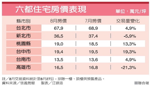 觀察全臺6大都會區房價,根據信義房屋統計,臺北市住宅平均成交單價每坪67.9萬元,比7月均價68.9萬元略減1%,房價逐步盤整。新北市8月平均單價每坪36.5萬元,也較7月37.4萬元略減2%;臺中、臺南、高雄市房價均價大致較上月持平,整體房價盤整回檔趨勢明顯。