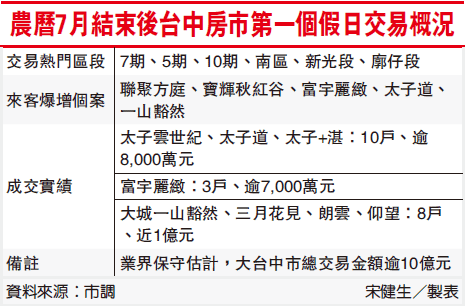 市調顯示,中部包括聯(lián)聚「方庭大廈」、寶輝「秋紅谷」、精銳「ACE特區(qū)」、富宇「麗致」、太子「云世紀」特A區(qū)、興富發(fā)「1號院」等桉,投資置產型來客或成交平均都成長五成至一倍。