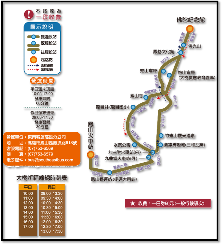 行程亮點: 整趟行程皆搭配大眾運輸無縫接軌,不用辛苦開車也能玩遍高雄大樹區,相當適合銀發族以及親子出游。