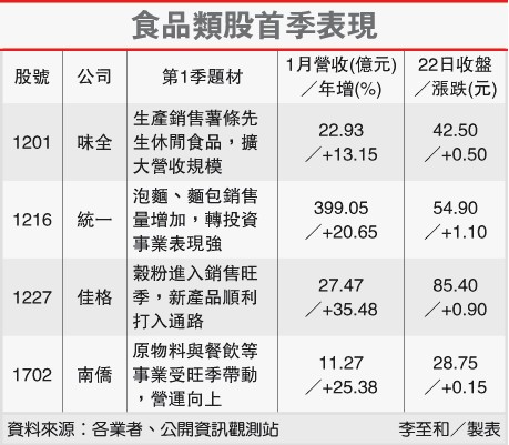 食品業(yè)者開發(fā)新產(chǎn)品意愿提高,食品類股今年展望樂觀,食品類股指數(shù)昨日為1163.49,上漲1.35%,居各類股漲幅第二,味全、統(tǒng)一、佳格等指標(biāo)股同步走揚(yáng)。
