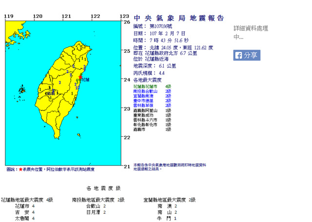 氣象局表示,7:43花蓮近海發生規模4.4的地震,地震深度6公里,花蓮震度4級,南投、宜蘭、臺中、云林為2級,嘉義、臺東、彰化為1級。