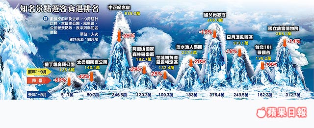 太魯閣公園游客中心等,墾丁降59%衰退最嚴重,太魯閣降43%次之,衰退主因之一是陸客減少,但墾丁日前又發生兩盤鹵味1845元爆貴事件,引爆國人痛批景點坑人、吃住都貴森森的怒火,對國旅雪上加霜。陸客不來、國人不愛,何處會是下一個觀光雪崩的墾丁,各景點都剉咧等。