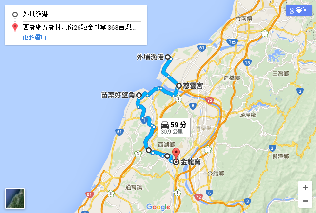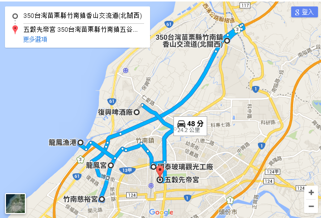 第一天:A.竹南交流道 13.3km B.中港慈裕宮 1.3km C.后厝龍鳳宮 1.4km D.龍鳳漁港 2.9km E.國泰玻璃工廠 3.0km F.竹南啤酒場 3.9km G.五榖宮(住宿竹南??或頭份)