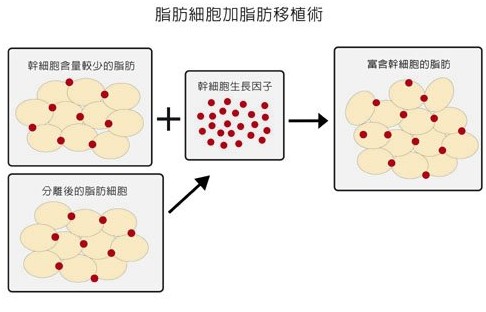 近期醫學發現,我們自體細胞中的間充質干細胞(ASC,Adipocyte stem cell),主要是在負責血管的新生、增加氧氣和養分,及提供生長因子給乳房里面的脂肪,同時在需要的時候會轉變成脂肪細胞。如果能夠提高抽取出來的脂肪其間充質干細胞的濃度,自然能夠解決所令人畏懼的問題。