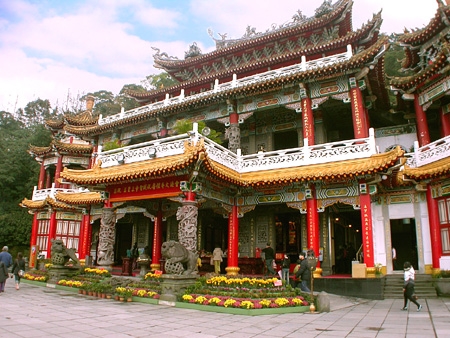 這座純中國式的廟宇建筑,金碧輝煌、莊嚴肅穆,區(qū)內(nèi)主建筑包括凌霄寶殿、大雄寶殿、大成殿,另設(shè)有禪房、靜室、祈夢室等;凌霄寶殿建筑富麗宏徫,雕繪巧奪天成,頗有氣宇軒昂的氣概。大雄寶殿位在正殿后方,供奉泰國佛祠,金黃色圓頂建筑,四周有數(shù)座佛像盤腳跌坐,是指南宮最具雄偉的建筑。大成殿在指南樂園的后方,殿內(nèi)供奉孔子、孟子、曾子及堯舜三官大帝,廟宇莊嚴肅穆,蔚為儒、道、釋三教合一的宗教勝地,也是建筑藝術(shù)的代表。指南宮神明靈驗,因此信徒廣增,香火一向鼎盛,尤其祭祀節(jié)日,總見來自各地的善男信女至此進香,人潮將寺廟擠的水泄不通,如今,指南宮已發(fā)展成為觀光勝地。