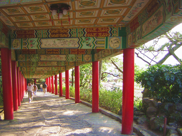 循著仙公廟后的左側(cè)小徑,可到達大雄寶殿。2、3樓是正殿,供奉釋迦牟尼佛,其中有一尊是泰國巴博元帥惠贈的泰國國寶-釋迦牟尼金佛,是參照印度科達時代的印度佛像形態(tài),由九種金屬礦石精工鑄成,是該廟最特別的一尊佛像。從仙公廟后的右側(cè)小徑,順著景色怡人的斜坡廊道直走,就可來到凌霄寶殿。天兵天將護衛(wèi)在門檐上,殿內(nèi)有許多神佛,顯得莊嚴肅穆。沿寶殿左側(cè)走道過去,是指南觀光樂園,視野遼闊。旁邊有露營場,兩地之間有山路通孔子殿,殿外有白墻,墻上有孔子和弟子周游列國的浮雕,并環(huán)繞一雙麒麟,象征孔子的精神,就像鳳毛麟角般珍貴。