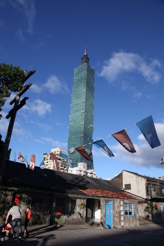 【四四南村】 別有舊時風味的四四南村與臺北金融中心建筑群的強烈對比,展現信義區過去與現在的建筑風格。