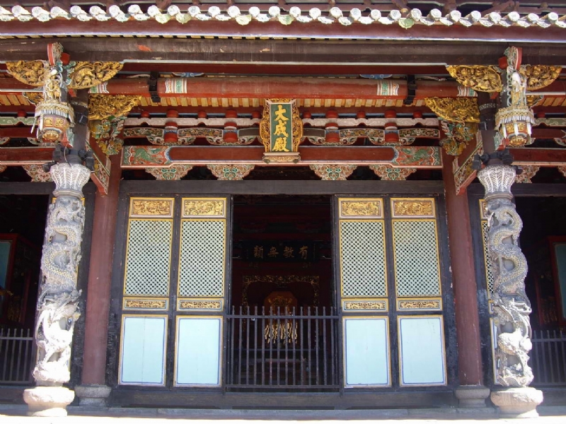 孔廟。孔廟主祀中國(guó)最偉大的老師──大成至圣先師孔子,以及歷代的先賢、先儒。由于孔子崇尚樸實(shí),所以孔廟的建筑較簡(jiǎn)單樸素,不像一般廟宇有華麗的裝飾,連門(mén)口也沒(méi)有放置石獅,孔廟以大成殿為主,站在大成殿外,可看到中間的屋頂上,有一對(duì)圓筒,叫做藏經(jīng)筒。在中國(guó)古代歷史上,秦始皇為了便于統(tǒng)治,所以實(shí)施愚民政策,曾經(jīng)燒毀書(shū)籍、殺害讀書(shū)人,當(dāng)時(shí)讀書(shū)人為了把書(shū)籍保存下來(lái),就在屋頂上蓋了個(gè)像煙囪的藏書(shū)筒,把書(shū)藏在那里,來(lái)避免被燒毀的命運(yùn)。所以孔廟也建有藏經(jīng)筒,以表達(dá)對(duì)當(dāng)時(shí)讀書(shū)人愛(ài)書(shū)精神的敬佩。同時(shí),在前方屋頂上,有梟鳥(niǎo)的雕飾。梟鳥(niǎo)是一種既不孝順又殘暴的鳥(niǎo),可是孔子也對(duì)它施予教化,所以梟鳥(niǎo)雕飾,是代表孔子有教無(wú)類(lèi)的精神。