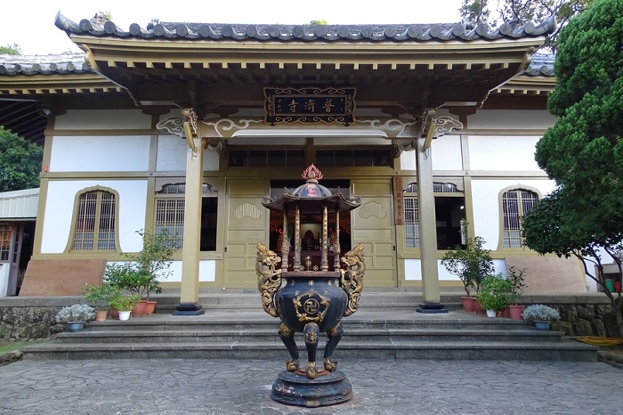 位于北投區溫泉路上的普濟寺,由于地勢較高,參訪時得爬上兩段階梯,走在其間樹影參差斑駁,頗有禪意。此寺廟亦為臺灣罕見的日本真言宗佛寺,初建于1905年,寺中供奉湯守觀音,北投民眾都視這座佛寺為溫泉守護寺。