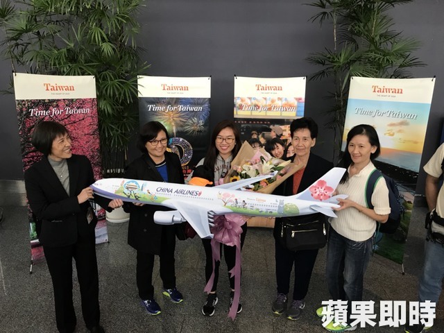 《蘋果》記者今也分別到松山、桃園等機場等候,該名千萬旅客終于在上午11時50分前,于桃園機場出現,其是搭乘酷航TR892航班抵達,觀光局盛大歡迎,遞上鮮花外,并將贈送國籍航空公司雙人全球不限航點經濟艙來回機票,國際觀光飯店住宿券及喔熊文創商品。