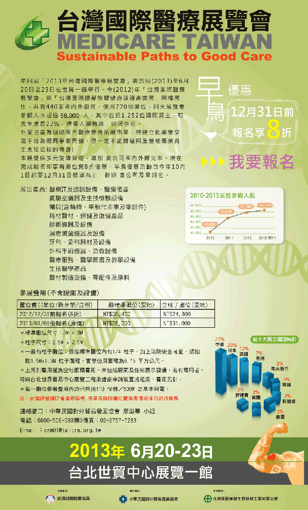 地點:臺北世貿一館(臺北市信義路五段5號). 活動日期: 2013-06-20 ~ 2013-06-23 報名日期: 2012-10-05 ~ 2013-05-31 聯絡人: 外貿協會廖淑華小姐 電話: 0800-506-088轉3 傳真: 02-2757-7283 主辦單位