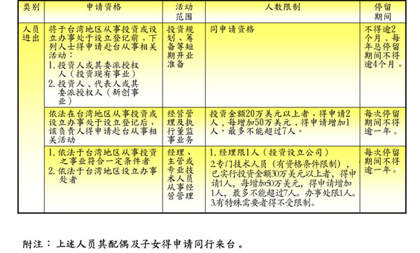 陸資入臺投資配套設措施(申請資格、人數限制、活動范圍、停留時間)